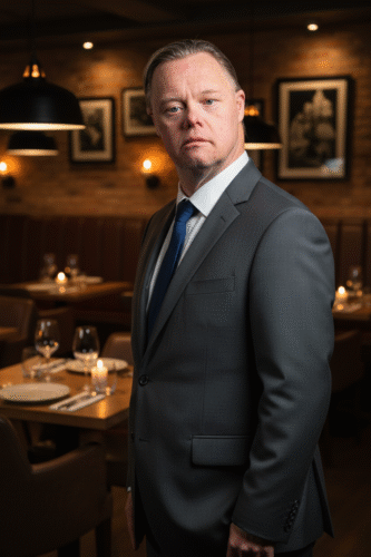Firefly_Gemini Flash_Låt ansiktet vara. Klä honom i en kostym och generera en bakgrund som ser ut som en m 894715